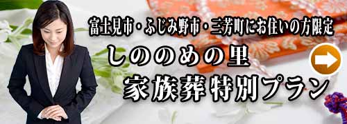 当プランは富士見市、ふじみ野市、三芳町で構成する入間東部地区事務組合が運営する公営斎場しののめの里を利用した式場使用料・火葬料金を料金に含めた1日葬特別プランです。富士見市、ふじみ野市、三芳町にお住いの方は民間式場よりも安価で1日葬が執り行えます。また、しののめの里は火葬場が敷地内に併設されているので火葬場に移動する為の霊柩車、マイクロバス等の費用が不要です。
